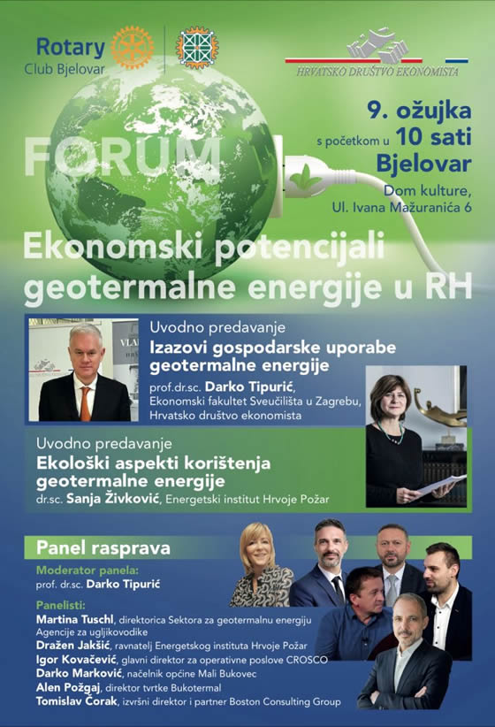 Pozivamo vas na forum pod nazivom „Ekonomski potencijali geotermalne energije u Republici Hrvatskoj” u organizaciji Hrvatskog društva ekonomista i Rotary kluba Bjelovar, koji će se održati u subotu, 9. ožujka 2024. s početkom u 10 sati u Domu kulture Bjelovar.