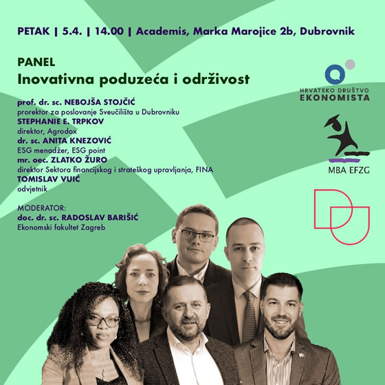Panel rasprava “Inovativna poduzeća i održivost” koje zajedno organiziraju Hrvatsko društva ekonomista, Udruga MBA EFZG Alumni, Ekonomski fakultet Zagreb i Sveučilište u Dubrovniku, održat će se 5. 4. (petak) u prostorima Academis , Marka Marojice 2b, u Dubrovniku s početkom u 14 sati.